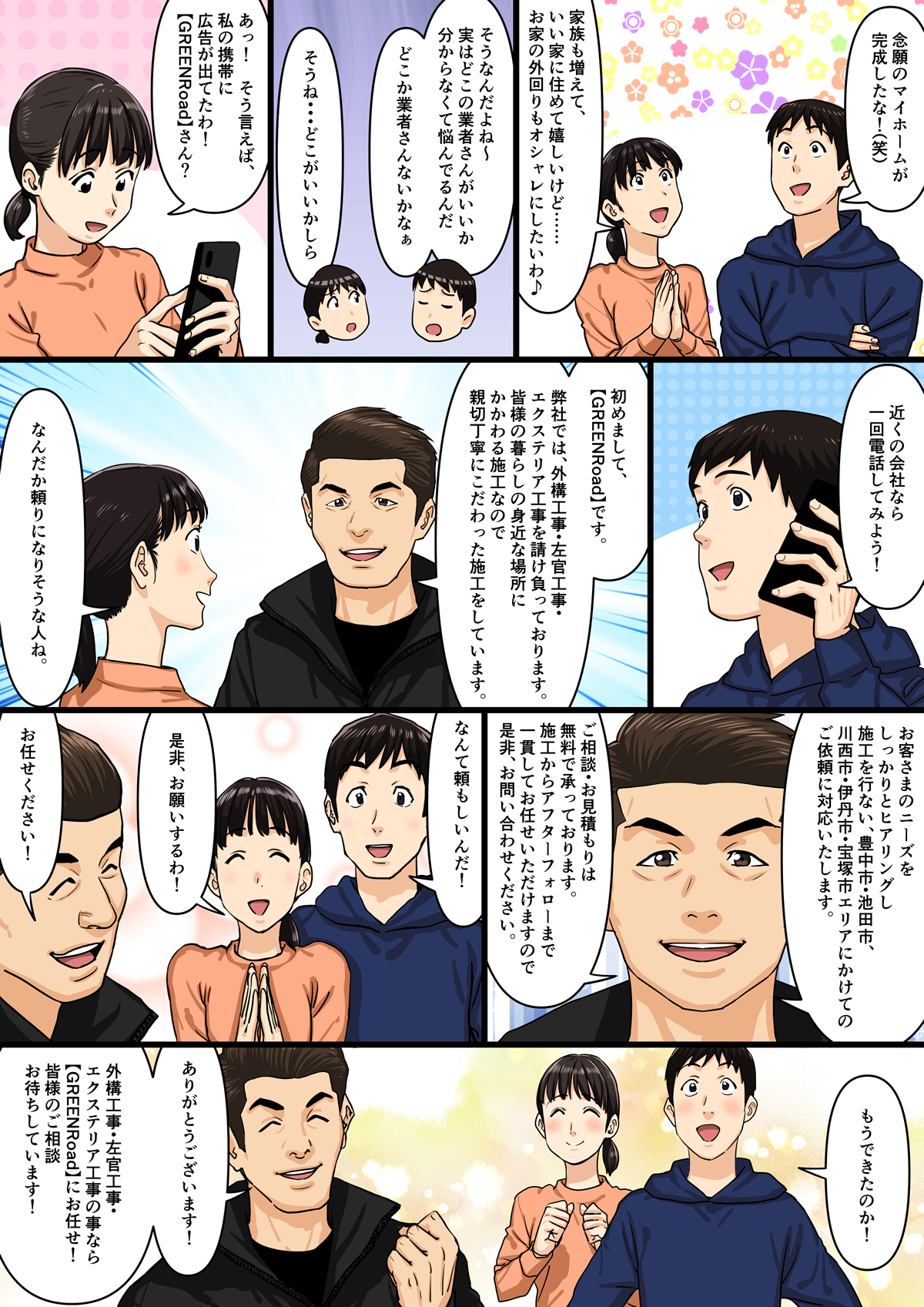 GREENRoadは、外構工事、左官工事、エクステリア工事を専門とし、大阪府豊能郡を中心に、大阪府豊中市、池田市、兵庫県川西市、伊丹市、宝塚市、尼崎市、およびその他近隣エリアにてご依頼に対応しております。熟練のプランナーが専門知識と長年培った技術と知恵を活かし、ご予算に応じて素敵なお庭をご提案いたします。